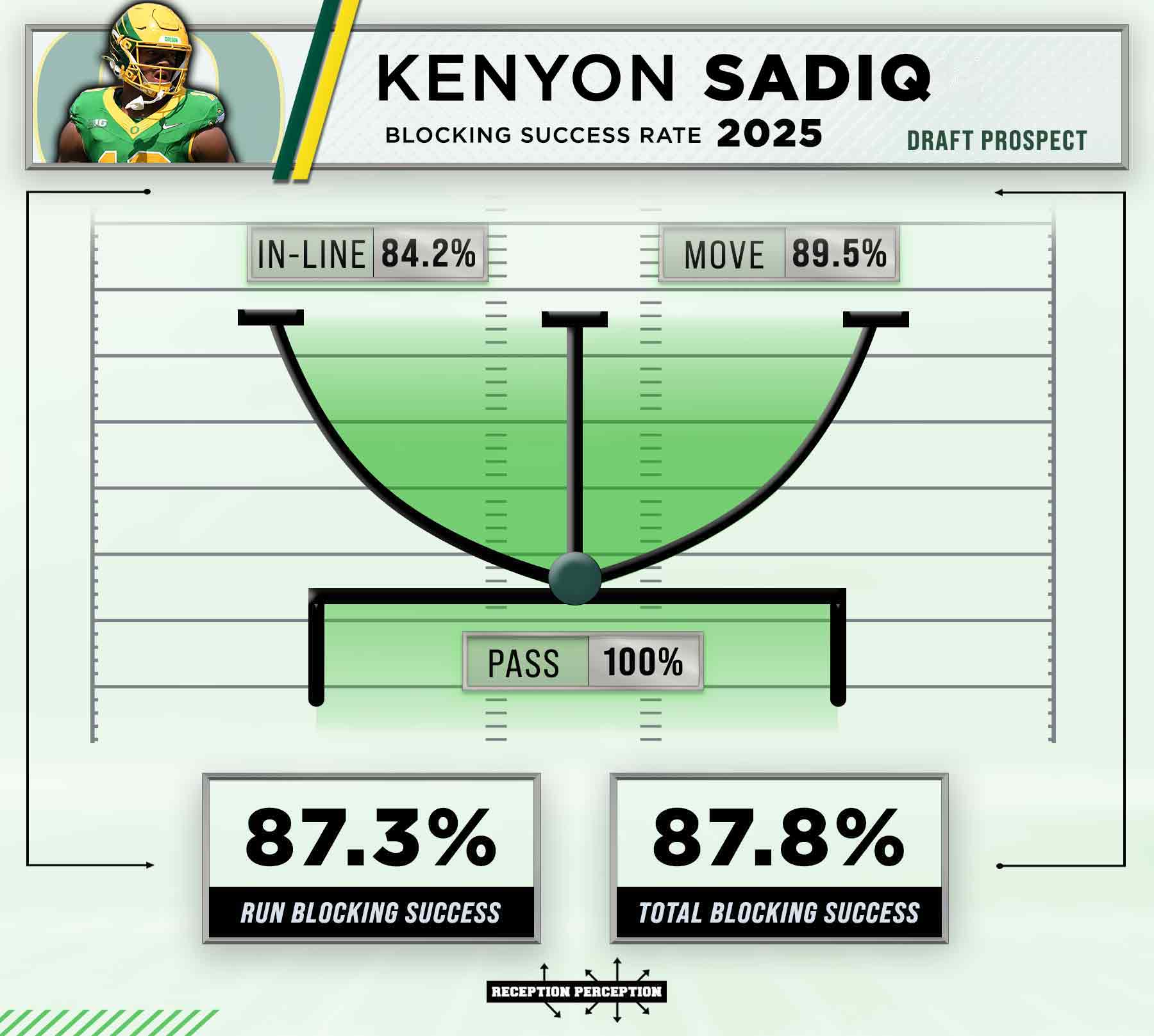 Receiving is not Sadiq’s only responsibility. His effort and willingness as a blocker are the stuff of dreams among TE coaches and run-game coordinators. He posted a solid 84.21% success rate in-line in a role that did not shelter him from handling defensive ends on the playside of runs. Despite that, a majority of his use took place on the move. Oregon pulls the TE frequently in their counter-heavy run game. Sadiq is really solid on the move at a nearly automatic 89.52% success rate.