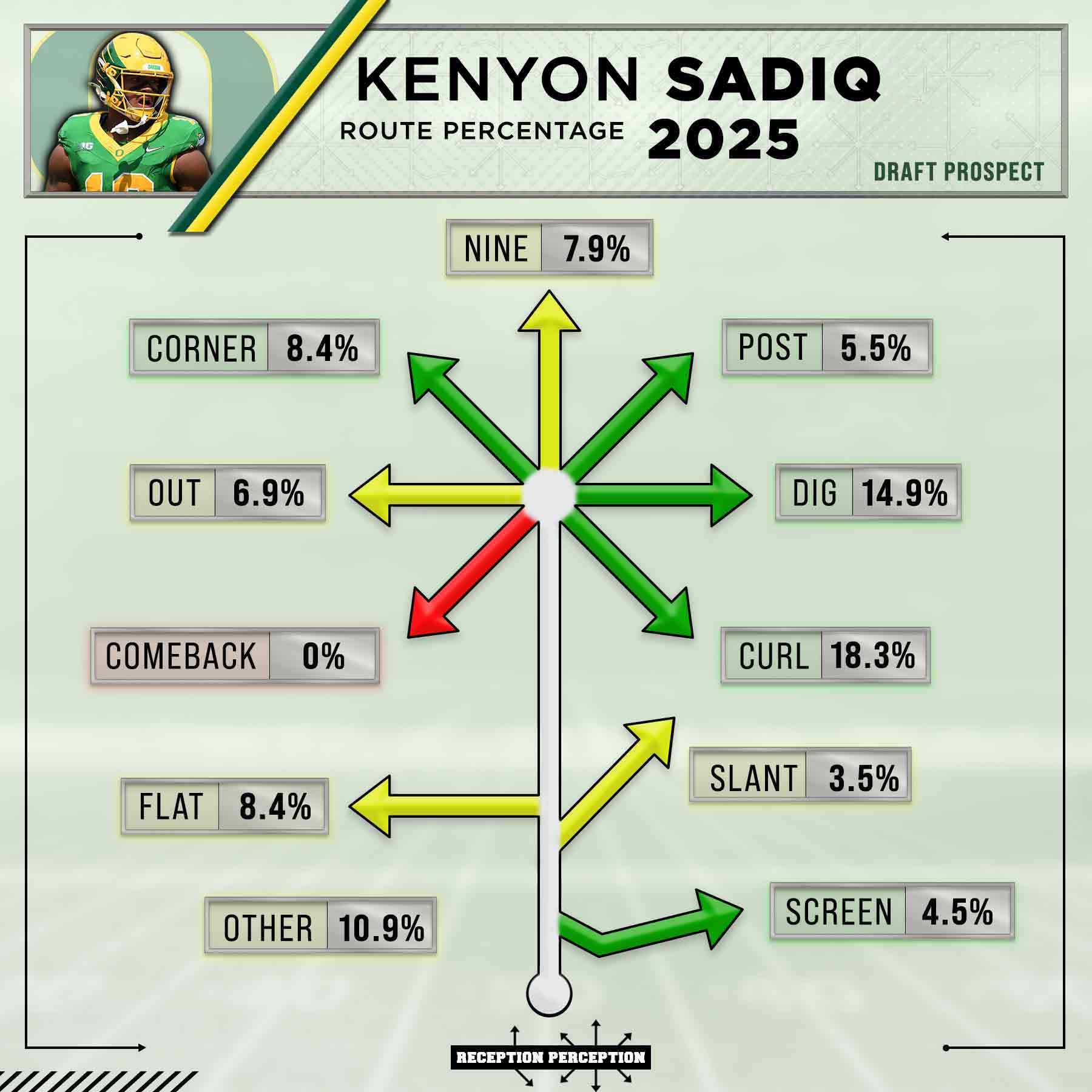Sadiq’s field-stretching speed was used in a variety of alignments at Oregon. A chunky 19.8% of his routes came from a true slot alignment. Another 11.4% of his routes came from an outside WR spot.