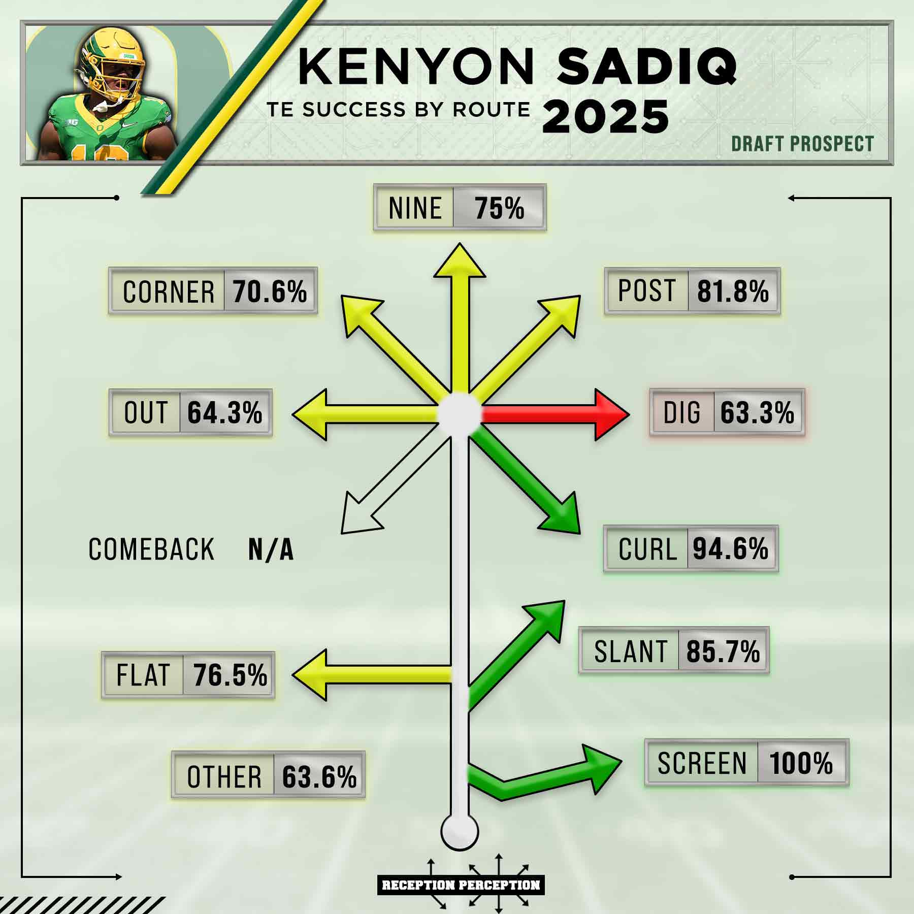He is mainly a weapon on static and linear routes. He gets a lot of run on curl-type routes to space out the underneath zones and get him moving after the catch. This route alone covers 18.32% of his usage at a blistering 94.59% success rate.