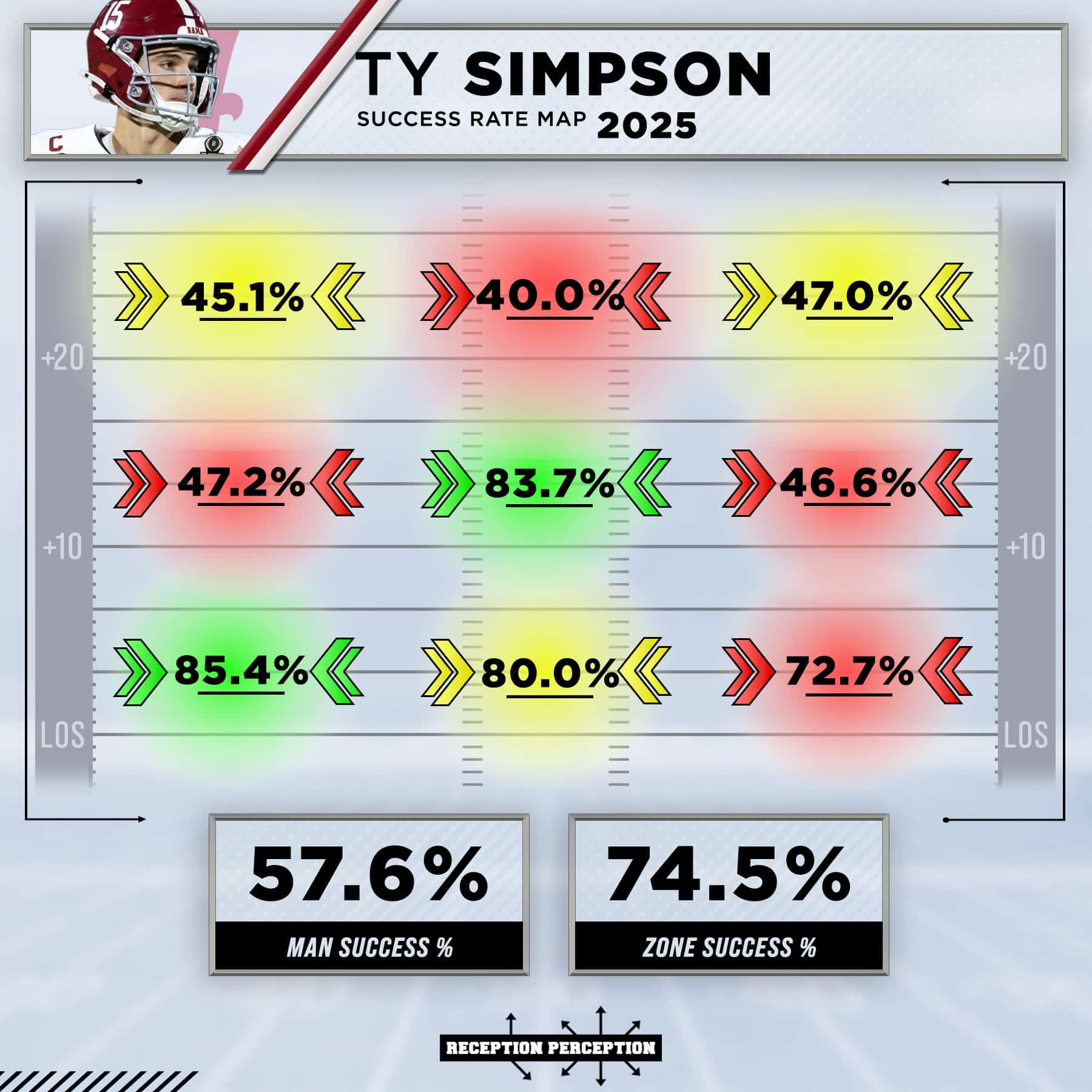 When it comes to being pro-ready, Simpson is actually further along than most guys in his situation have been. According to our Reception Perception charting, Simpson faced zone coverage 59.6% of the time, the highest percentage of the quarterbacks charted by at least 6%. This should help him in his transition to the pros, where defenses are in zone coverage approximately 70% of the time.