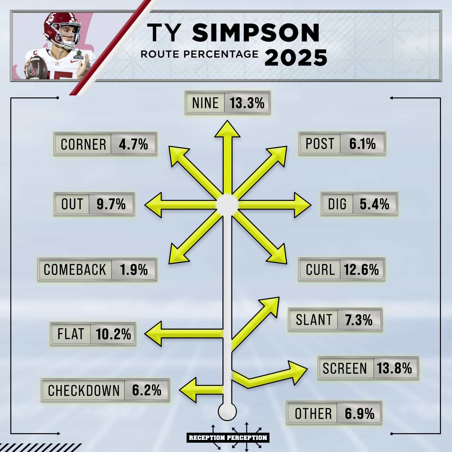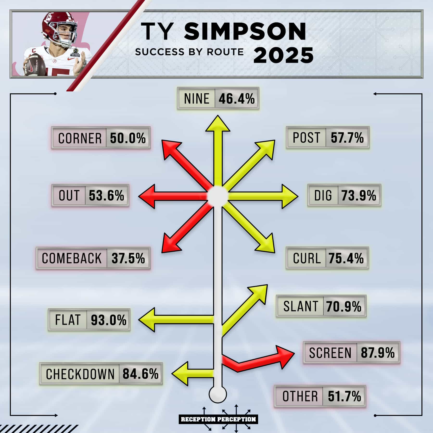While pretty much every college quarterback is running their offense out of shotgun or pistol, Alabama had Simpson undercenter on 8.8% of his charted pass attempts, which was leaps and bounds higher than any other FBS quarterback charted by reception perception. On the surface that seems like a small thing, any quarterback can easily learn how to play under center and get their footwork right, but for Simpson, this means he has one less thing to learn and practice in training camp. He’ll be able to get straight to install and learn the playbook.
